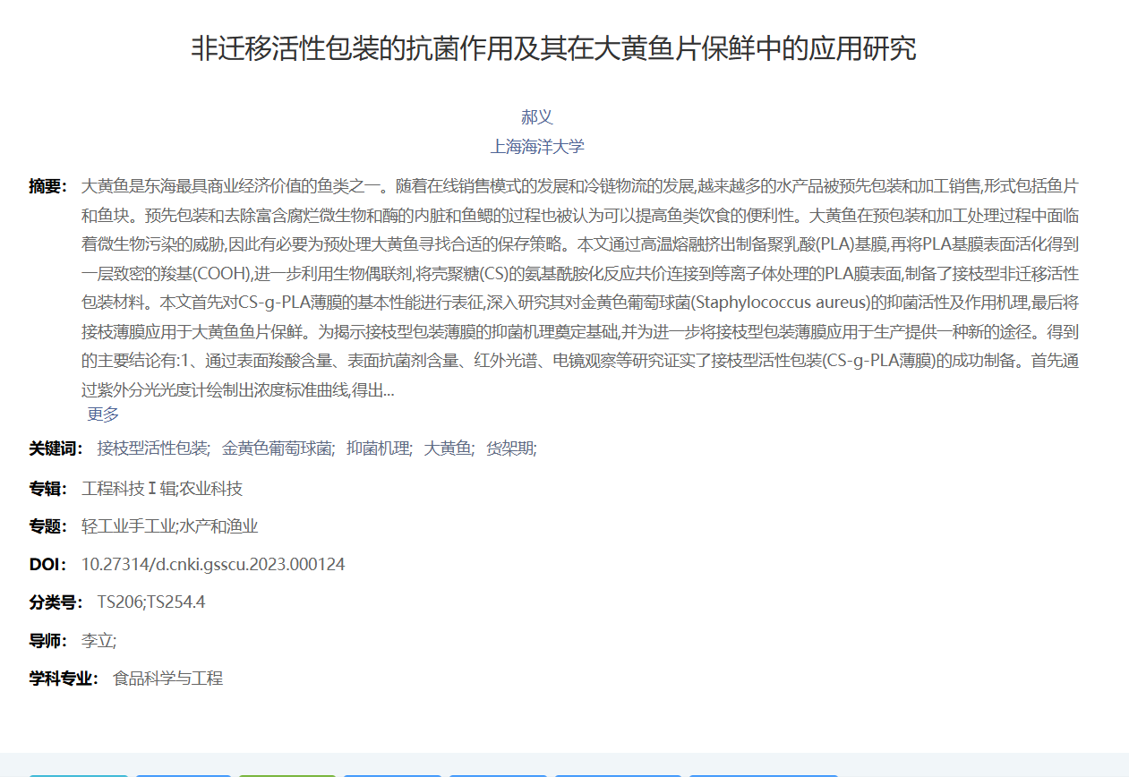 郝义,男,汉族,中共党员,安徽新华学院财会与金融学院财务管理专业2020届校友。2023年6月获上海海洋大学工学硕士学位,博士现就读于上海大学。近年来在ACS Sustainable Chemistry &Engineering(封面文章,中科院Q1)、LWT - Food Science and Technology(中科院Q1)、Comprehensive Reviews in Food Science and Food Safety(中科院Q1)、Food Packaging and Shelf Life(中科院Q1)、包装工程等国内外核心期刊上累计发表论文9篇,LWT - Food Science and Technology、International Journal of Environment and Climate Change等期刊审稿人;参编应急类教材一篇,获第五届“中国包装创新”奖学金。
